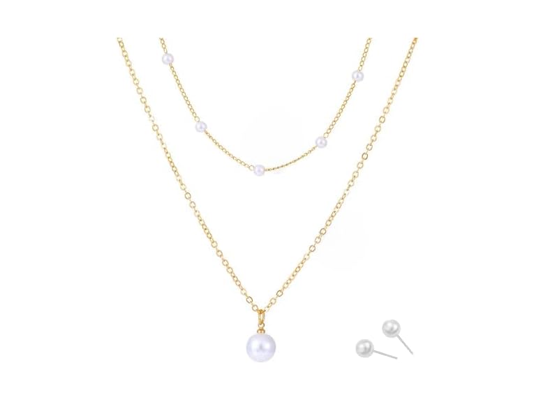 - (1) Gold Pearl Necklace for Women 14K Gold Plated Layered Freshwater Pearl Necklaces Trendy Simple Herringbone Chain Pearl Necklace for Girls Gold Jewelry Gifts