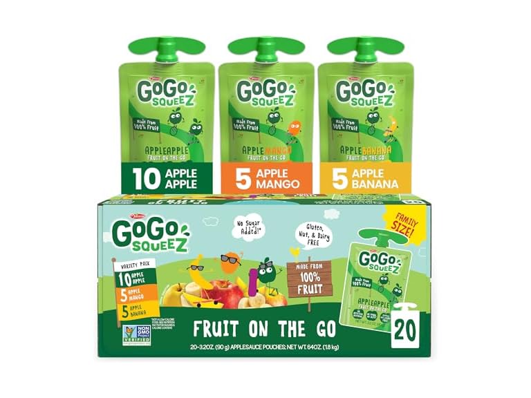 - Stock your pantry or fridge with this pack of 20, 3.2 ounce kid-approved snack pouches (3 flavors to choose from); GoGo squeeZ Fruit on the Go squeeze pouches are kitchen pantry safe (no refrigeration required)