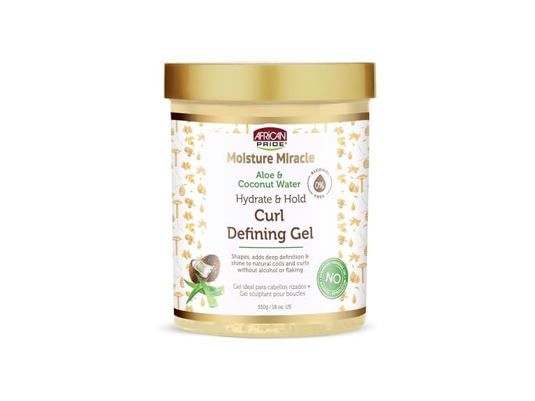 - (1) African Pride Moisture Miracle Hydrate & Hold Curl Defining Gel for Curly & Coily Hair, Controls Frizz, Hydrates, Defines Coils & Curls, No Flakes, 18oz