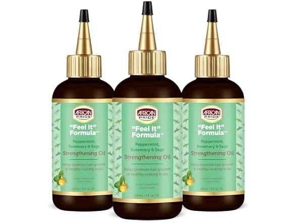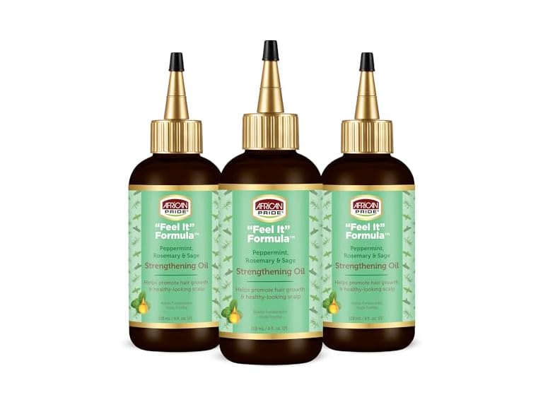 - (1) African Pride Feel It Formula Hair Strengthening Oil – Hair Oil with Rosemary, Peppermint & Sage – Hydrates Hair, Helps Strengthens Roots & Promotes Growth | 4oz (Pack of 3)