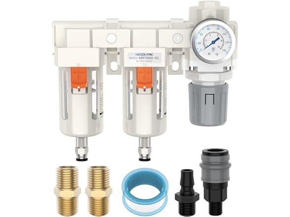 - Full Installation Kit: Professional kit includes semi-automatic drain and polycarbonate bowl, high accuracy 0-145 PSI gauge, mounting bracket, a pair of air couplers and plug kit with 2x 3/8"NPT fittings and 1x sealing tape,no need to buy extra, out of the box, quick and easy to install
