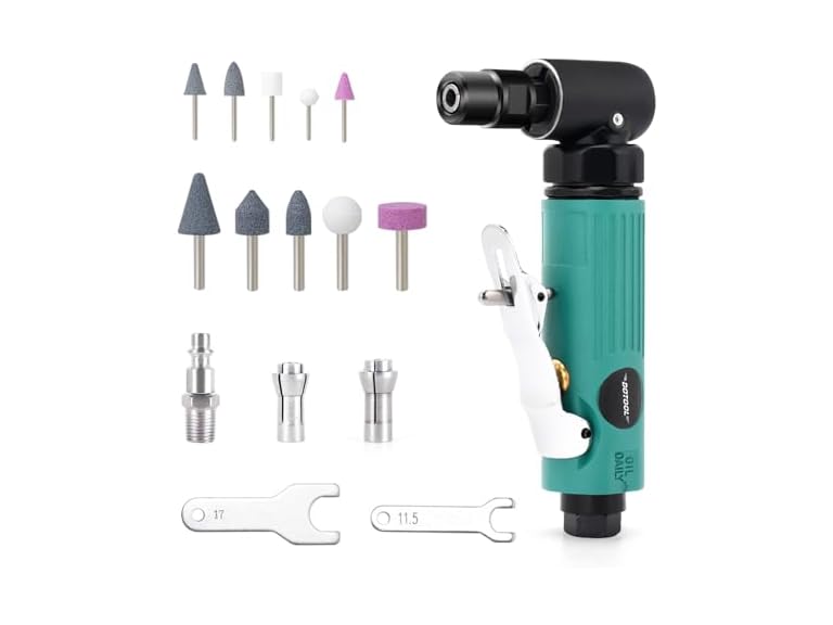 - COMPLETE ACCESSORIES:1/4" right angle die grinder with Straight Head, Equipped with 1/4" and 1/8" Collets, 10 x Grinding Stones, 2 x Hand Wrenches, 1/ 4 NPT Connector, oil bottle and Storage Case.