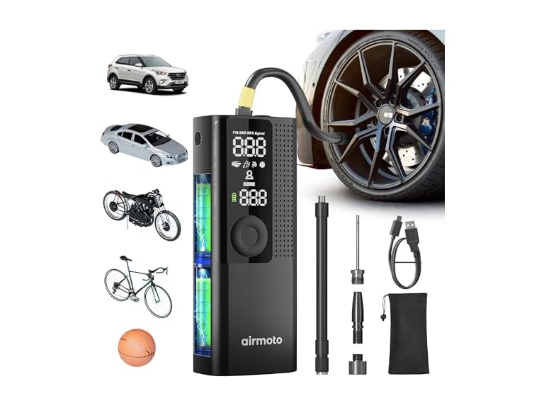 - INVEST IN PEACE OF MIND: Perfect gifts for women and gifts for men. Conveniently store this portable air compressor for car tires in your glove box or garage, ready for use whenever needed. The package comprises 1* Airmoto Car Tire Inflator, 1* Air Hose with Schrader attached, 1* General Nozzle Cone, 1* Needle Adapter, 1* Presta Adapter, 1* USB-C Charging Cable, 1* Storage Pouch and 1* User Manual.