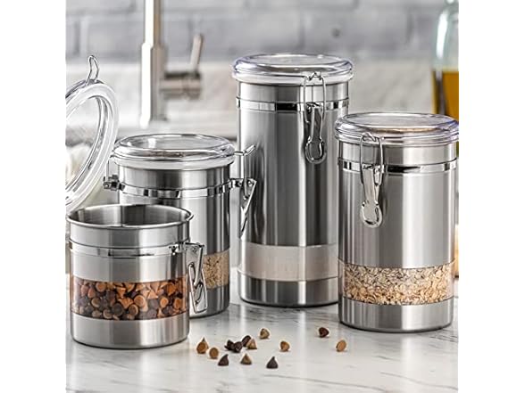 Features: SWEET DESIGN WILL SAVE YOUR TIME: Clear clamp lid and window allows easy viewing of canister contents. With transparent acrylic lid & window, you will save more time. They are great for storing cookies, coffee, flour, sugar, nuts, coarse cereals and more. This practical canister set is perfect for various occasions including countertop, restaurants, bistros, pubs, café, pantry and so on. HIGH QUALITY SAFETY MATERIAL: This Airtight canister is made of good quality 410 stainless steel, excellent rubber seals and clasps. It is safe for everyday use. Your new container set has no smelly odor and will store food with no BPA, toxic chemical or other chemicals that leach into food. AIRTIGHT SEAL AND SECURE CLAMP KEEPS FOODS FRESH: The rubber seal will stay on in place and perfectly connected to the edge of the canister. This would prevent air to enter, protecting the hermetic seal of the jar. Airtight canisters not only protect the contents from insects and moisture, but also ensures they remain fresh for a long time. EASY TO USE AND CLEAN: These stainless steel kitchen canisters are made with a wide 4.5" opening which makes it easy to use full size 1 cup measuring scoops. The canisters are dishwasher-safe, however we recommend hand-washing to protect the finish. A quick wipe with a damp cloth is sufficient for a light cleaning. And they are extremely user friendly. COMES IN AN ASSORTMENT OF CONVENIENT SIZES: Four canisters sized 4.5" diameter, and in various heights of 9", 7.4", 6.2", 5". Details:MULTI-FUNCTION STORAGE CANISTERS BUILD TO LAST - We have taken meticulous care to ensure that the containers you receive will last for years to come. Unlike most sellers on Amazon which have lids that easily break with use, our containers come with New and Improved Lids which are made up of High Impact Resistant and Durable ABS Plastic which means you donât need to worry about the Lids breaking. HIGH GRADE MATERIAL - Manufactured of high quality stainless steel sturdy material container and ABS Plastic lid and window with easy-to-use and sturdy metal clamps backed up by silicone gaskets for truly airtight storage. Keep your rice bug-free and your dried foods fresh. Your new container set will store food with no BPA, toxic chemical or other chemicals that leach into food and without smelly odor. SPACE SAVING DESIGN - These Durable Containers have been specially designed to minimize space, they are stackable and will easily fit into your refrigerator, freezer or cupboard, which enables you to get the kitchen organized and frees up space in the pantry. EASY TO CLEAN - These stainless steel Containers are also easy to clean, extremely USER FRIENDLY and ready to use. IDEAL GIFT - This set comes in a beautiful box which makes it an ideal gift for any family. Nobody else in the market provides more Value to You than us. KEEPS FRESHNESS - Our Lid-Lock Mechanism ensures maximum freshness and prolonged food storage by creating 100% airtightness which will not only protect the contents from ants and bugs, but also ensure they remain fresh for a long time. Item Condition:New