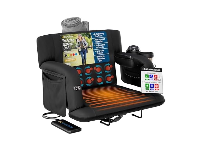 - (1) Alpcour Heated Massage Reclining Stadium Seat for Bleachers – Wide Bleacher Chair with Back Support and Cushion, Armrests, Large Pockets, and Multiple Safety Features – Best Stadium Seats Chairs