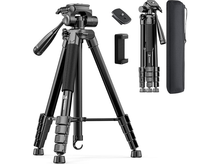 - 【73-INCH LIGHTWEIGHT TRIPOD】 - This lightweight tripod offers adjustable heights ranging from 19 to 73 inches. Equipped with a 1/4-inch mounting screw on the quick release plate, it is compatible with both cameras and smartphones.(Phone holder clamp range: 2.3 inch - 3.3 inch) When folded, it measures just 20 inches, making it highly portable and perfect for frequent location changes or travel. Despite weighing only 2.76 pounds, it can support a load of up to 8.8 pounds.