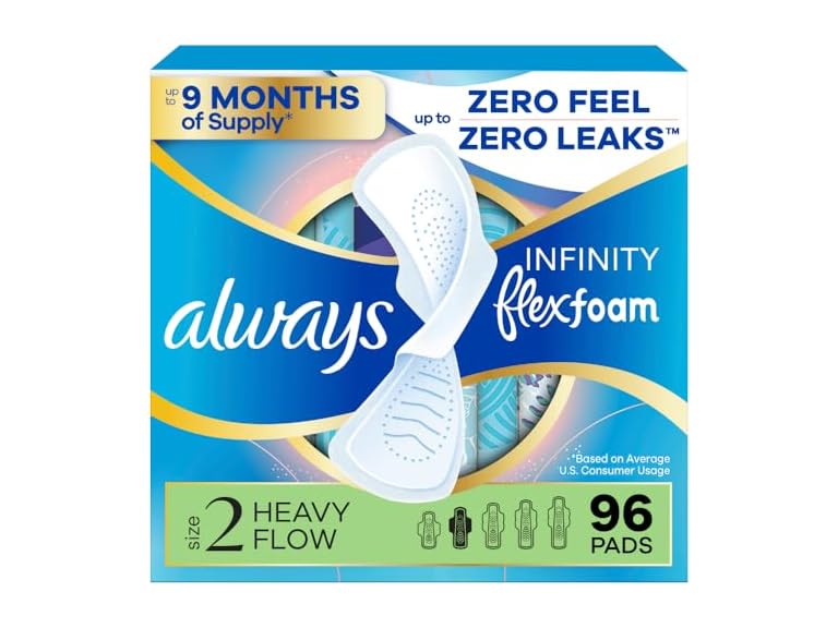 Always Infinity with FlexFoam Period Pads (with wings) are thin and flexible, featuring a dry top layer so that your pad moves with you, not against you. Experience up to zero feel protection, with form-fitting grooves that conform and mold to your body shape. Made with foam, not fluff, that flexes to your body, these pads can absorb 7X more than you need. The breathable top layer and super absorbent holes keep you dry and comfortable throughout the day. With Always Infinity with FlexFoam period pads, you can enjoy the confidence of up to zero leaks, zero feel, and zero bunching, allowing you to go about your day worry-free. Always Infinity with FlexFoam menstrual pads have been dermatologically tested, and approved by the Skin Health Alliance, an independent organization led by dermatologists and scientists. The qualification process includes an assessment of the ingredients, and clinical trial data. Always FlexFoam products have been endorsed by the SHA for several years and we will continue working with professionals to ensure our products meet high external standards. For those needing extra protection, try Always Infinity FlexFoam Overnight Absorbency period pads, that offer up to 12 hours of zero leaks and zero feel, for overnight use. And for those who are on-the-go, try Always Pocket FlexFoam, powerful protection made portable.