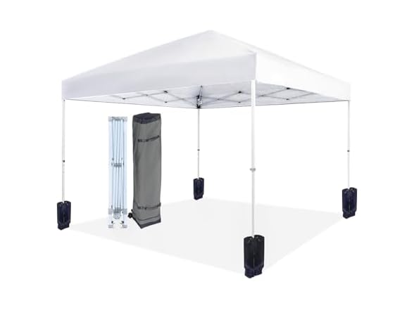 - (1) Amazon Basics Outdoor Pop Up 10 x 10 Canopy Tent for Events, Portable with Easy Setup, One-Push, Includes Wheeled Carry Bag, 8 Pegs, 4 Ropes, 4 Weighted Bags, White