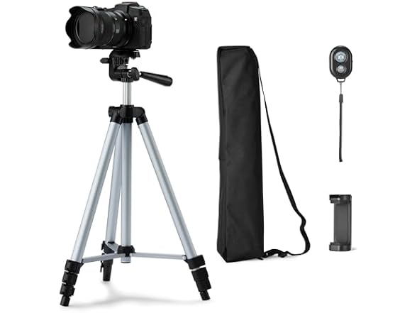 - (1) Amazon Basics 50" Lightweight Tripod for Camera and Phone with Travel Bag, Remote Control and Phone Holder, Height Adjustable, Aluminum, Silver