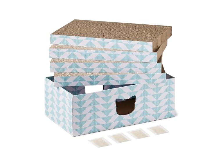 - Amazon Basics Corrugated Cardboard Cat Scratchers, FSC-Certified, 4-Pack, 16.5 x 10 x 1.5 in, Blue