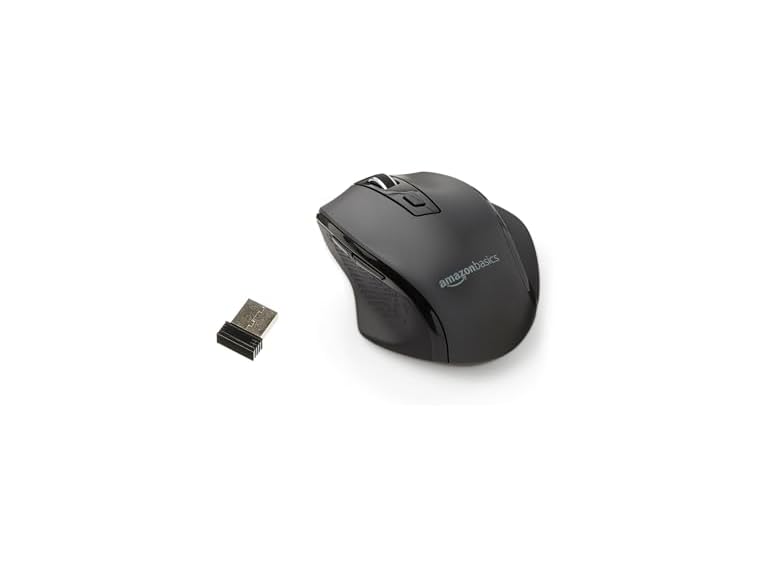- (1) Amazon Basics Portable Wireless Computer Mouse, Ergonomic, 2.4 GHz Optical, DPI Adjustable, Easy to Use, Compatible With PC, Mac, Laptop, Black