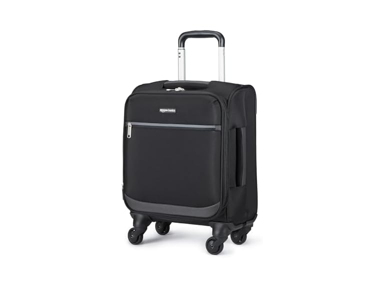 - (1) Amazon Basics Luggage, 15" Small Carry-On Softside Suitcase With Wheels, With Four 360-Degree Multi-directional Spinner Wheels, Expandable Space, Zippered Pocket and Straps, Telescopic Handle, Black