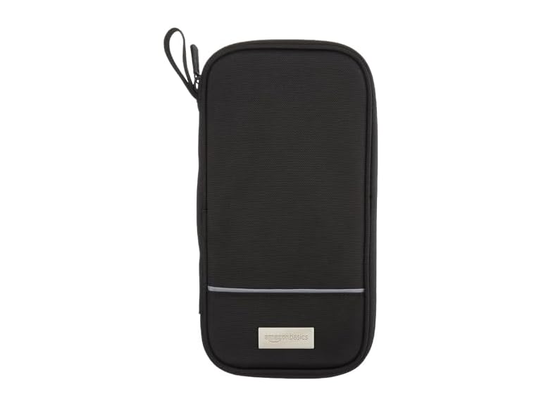 - (1) Amazon Basics RFID-blocking Passport Wallet, Passport Holder for Travel, 100% Nylon Material with Durable Zipper Closure, Zippered Pockets, Slots for Cards, 10"x5", Black, Solid