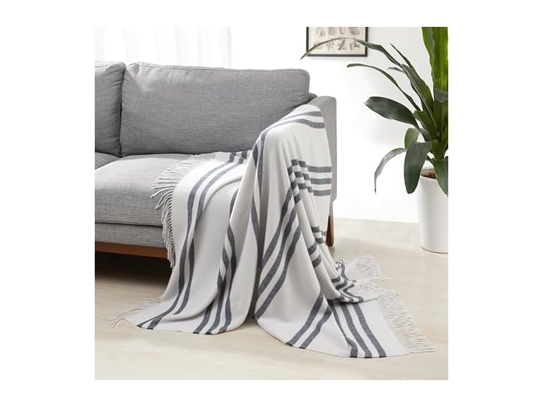 - (1) Amazon Basics Room Décor Throw Blanket, Lightweight and Cozy in Recycled Polyester, Light Grey With Blue Stripes, 50"x 60"