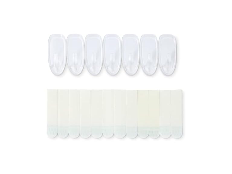 In the Box: (1) Amazon Basics Adhesive Wall Hooks, 7 Hooks and 12 Adhesive Strips, No Tools Adhesive Hooks for Hanging, Organization and Storage, Holds up to 2 lb, Medium, Transparent