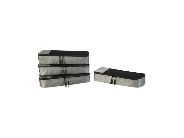 - Amazon Essentials 4-Piece Packing Cubes Travel Accessories Set, Luggage Organizer with Double Zipper, Mesh Top, 100% Polyester, Slim, Gray (Previously Amazon Basics)
