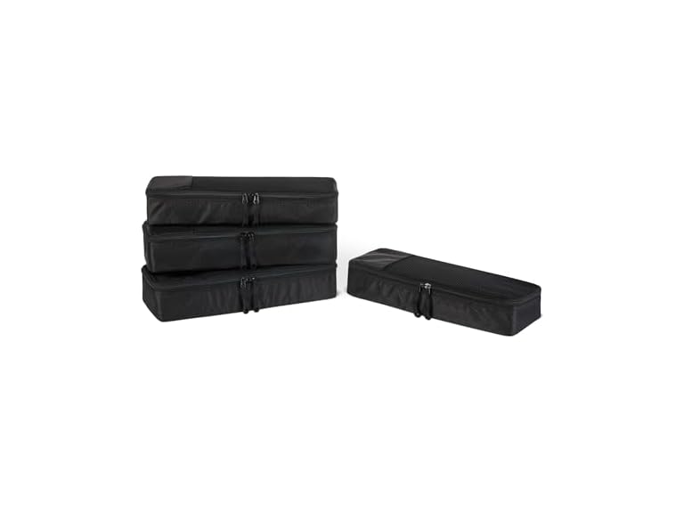 - (1) Amazon Essentials 4-Piece Packing Cubes Travel Accessories Set, Luggage Organizer with Double Zipper, Mesh Top, 100% Polyester, Slim, Black