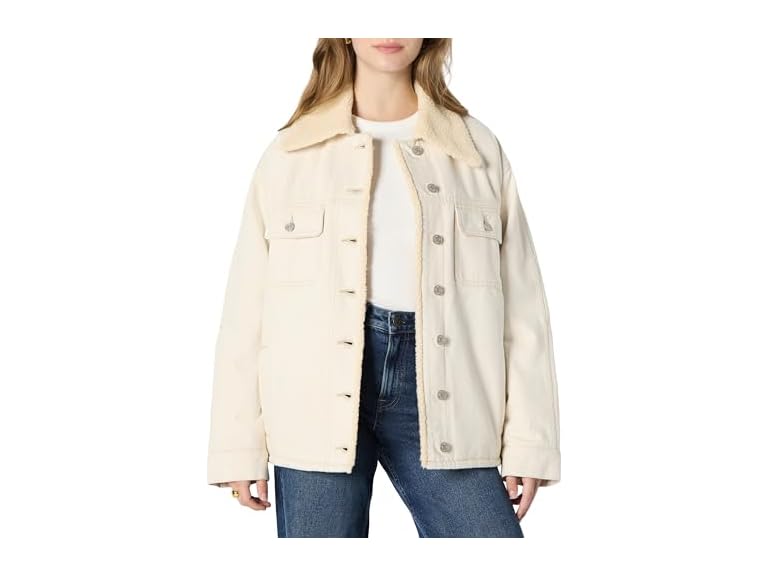 - DENIM JACKET WITH FAUX SHEARLING LINING: Vintage inspired and modernized with a generous cut, this jacket is crafted in cotton denim with a faux shearling collar and lining for style and warmth