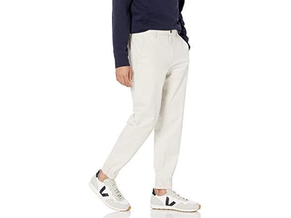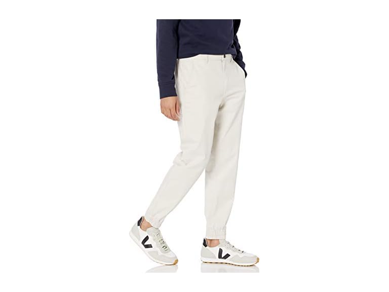 - These men’s joggers with pockets offer a slim fit through the hip and thigh, tapering to a modern, elasticated cuff at the ankle. Designed for both casual and athletic settings, these men's jogger pants provide comfort at the waist and flexibility with their breathable stretch cotton twill fabric. Combining the neat detailing of chinos with the relaxed appeal of jogger pants, these pants are ideal for many occasions. The practical zippered fly and button closure, complemented by two front hand pockets and two welt back pockets, provide both functionality and a sleek appearance