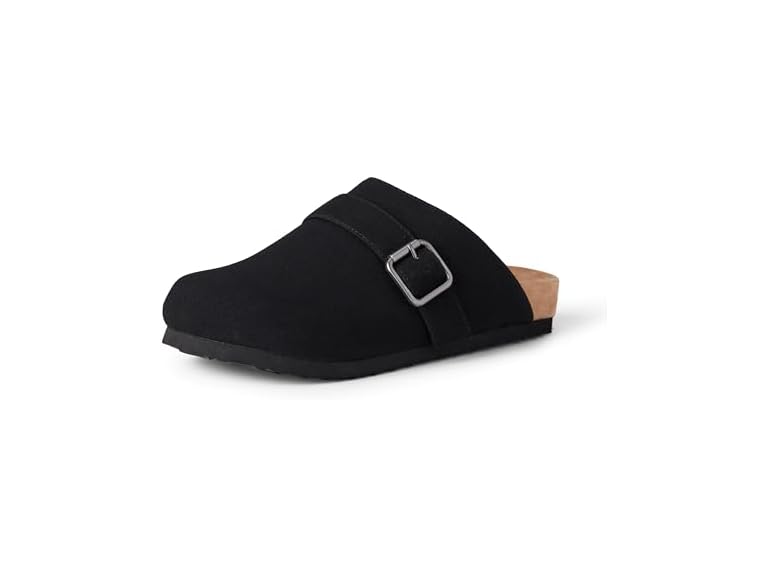 - STYLE: These clogs feature a traditional slide-style upper, buckle detail, and wrapped faux suede sole