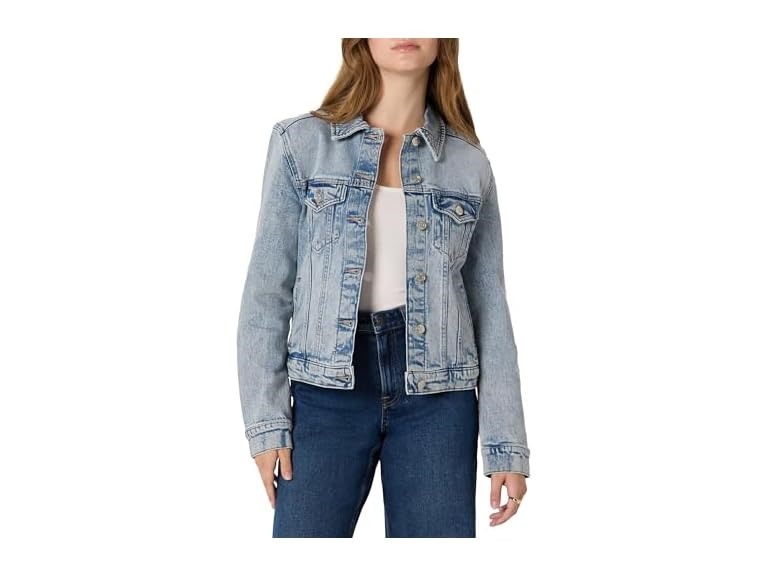 - (1) Amazon Essentials Women's Regular-Fit Low Stretch Denim Button-Front Trucker Jacket