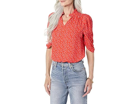 - DETAILS: Features a stand collar with ruffle detail, v-neck for easy popover, and beautifully draped sleeves.