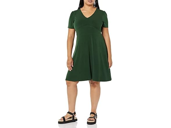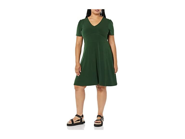 - Amazon Essentials Women's Short Sleeve V Neck Gathered Fit and Flare Dress
