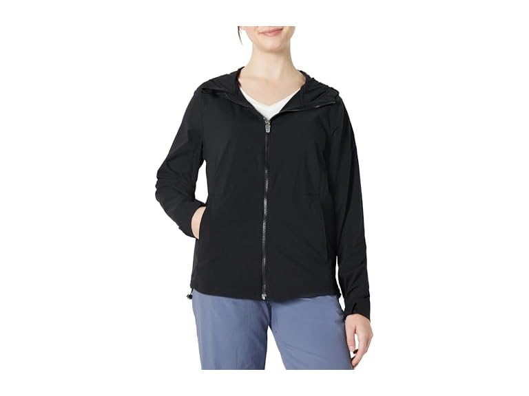- DETAILS: Full-length front zipper, adjustable hood, shaped body with back dart details, zip pockets, adjustable velcro cuffs, back venting, packable design