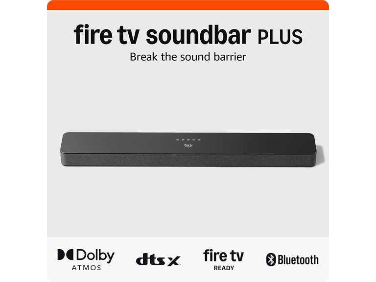 - Fire TV Soundbar Plus – Elevate your audio with an all-in-one 3.1 soundbar that’s easy to set up. Featuring built-in bass, crisp dialogue, Dolby Atmos, and DTS:X.