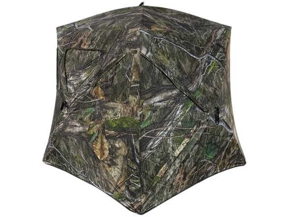 - CONVENIENT FEATURES: Includes nine windows with Camo Mesh and a silent hook-and-elastic triangular window system, a V-shaped zippered door, and an interior mesh storage pocket. Also comes with 4 tie-downs, 12 steel ground stakes, and 8 stake loops.