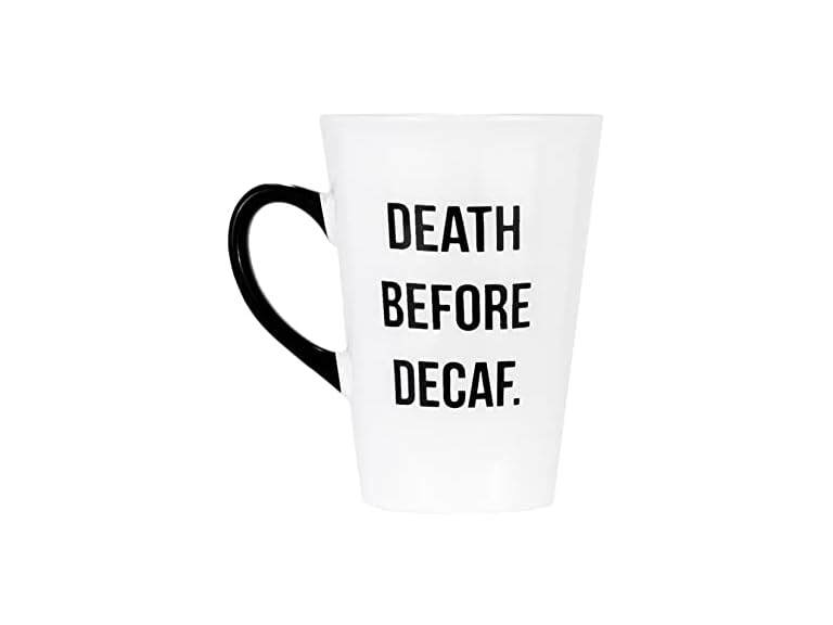 - DESIGN: This large mug says “Death Before Decaf” in black lettering on a white mug with a black handle.