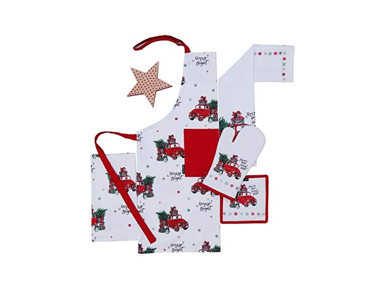 - (1) AMOUR INFINI Oven Mitts and Pot Holders with Chef Apron and Kitchen Towel 5 Piece Washable & Reusable Christmas Kitchen Decor Gift Set for Festive Cooking - Decorative Design & Functional
