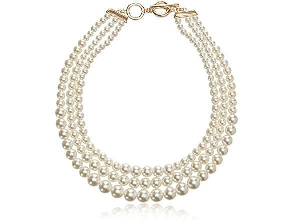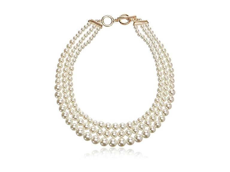 Experience timeless elegance and charm with this layered pearl collar necklace for women. This piece of women's jewelry is an enduring symbol of sophistication and femininity. The necklace features three strands of blanc faux pearls, each carefully crafted to form a stylish collar. The pearls' lustrous sheen and the necklace's gold-tone finish create a beautiful contrast, making it a standout piece in our women's fashion collection. Designed for the modern woman, this necklace effortlessly merges classic aesthetics with contemporary design. It's not just a necklace; it's a statement. Whether you're dressing up for a special occasion or adding a touch of glamour to your everyday outfit, this women's pearl necklace is the perfect accessory. This is the kind of necklace that embodies women's fashion, making it a must-have addition to your jewelry collection. Anne Klein was a visionary designer who originated the concept of a fully coordinated closet, providing a uniquely American point of view to the global fashion industry. Her trademark separates became the hallmark of a purposeful and stylish wardrobe that has informed trends for decades. At Anne Klein, our goal is to be the go-to resource for her wardrobe and lifestyle. Our collection is designed to be infinitely accessible. We manifest compassion and acknowledge the power of women. We materialize this essence, embodying “think like a woman.”