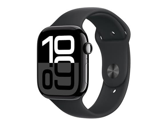 - (1) Apple Watch Series 10 [GPS 46mm case] Smartwatch with Jet Black Aluminum Case with Black Sport Band - S/M. Fitness Tracker, ECG App, Always-On Retina Display, Water Resistant