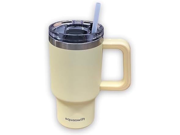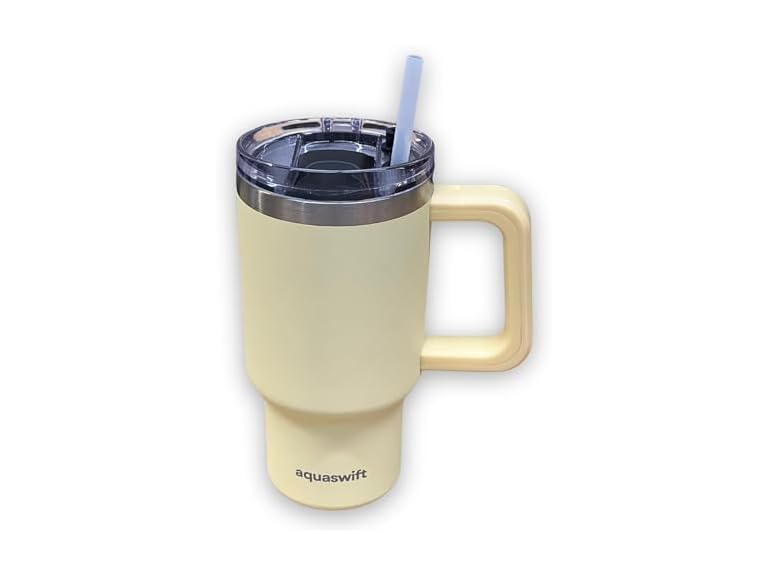 - (1) aquaswift flow 32oz Insulated Tumbler with Handle & Straw Lid ‚ Stainless Steel, Leak-Proof, Vacuum-Sealed, Travel Mug ‚ Ideal for Iced Coffee, Cold/Hot Drinks, Yellow