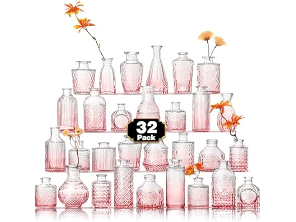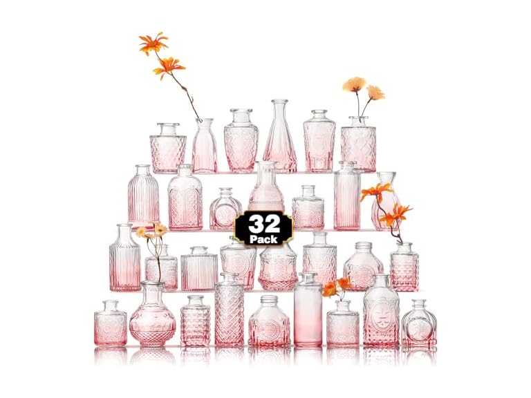 - Wide Range Of Styles: Contains 32 gradient pink bud vases in different styles and shapes. Each vase has a different design, great style and character, vintage and chic. The pink glass vases set has no bubbles, the pattern is bumpy and smooth to touch, and the thickened bottom design is practical and safe.30 mini flower vases can meet most of your decorative needs