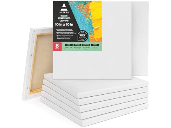 - (1) ARTEZA Stretched Canvas, 10 x 10 Inches, Pack of 8, Blank White Square Canvas for Painting for Acrylic, Oil and Gouache Paints