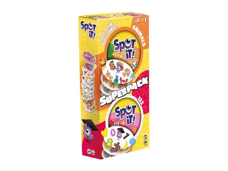 - DOUBLE THE EDUCATIONAL FUN: This SuperPack includes two themed Spot It! games — Spot It! 1,2,3 for mastering numbers, shapes, and colors, and Spot It! Animals to discover creatures of the earth, sky, and sea.