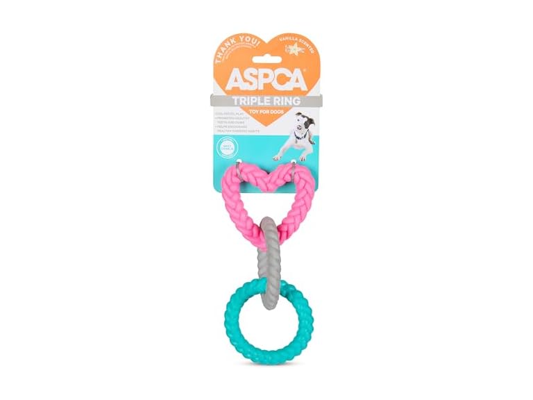 - (1) ASPCA Triple Rings Dog Toy – Vanilla Scented Tug & Fetch Chew Toy for Dental Health – Durable TPR Design
