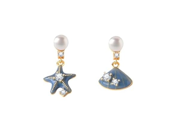 - Mismatched design: Charming asymmetrical earrings featuring blue starfish and shell designs, adorned with sparkling crystals and natural pearls.