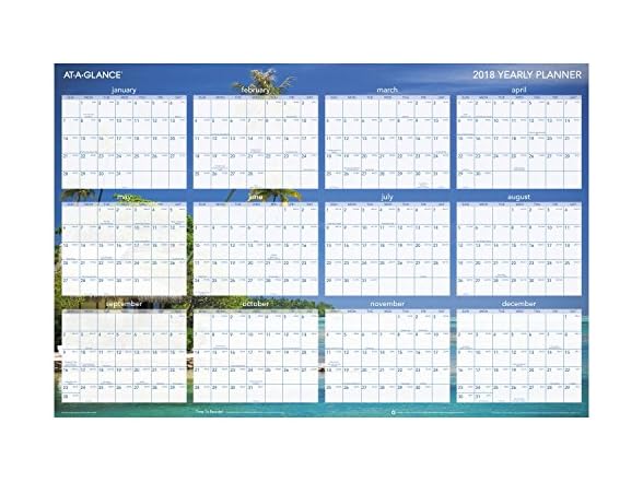 - Yearly planner is reversible, and erasable, with 12 months on each side. Full-color tropical escape theme adds fun and tranquility to any workspace.