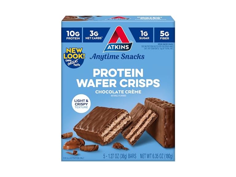 - (1) Atkins Chocolate Crème Protein Wafer Crisps, Protein Dessert, 4g Net Carb, 1g Sugar, High in Fiber, Keto Friendly, 5 Count