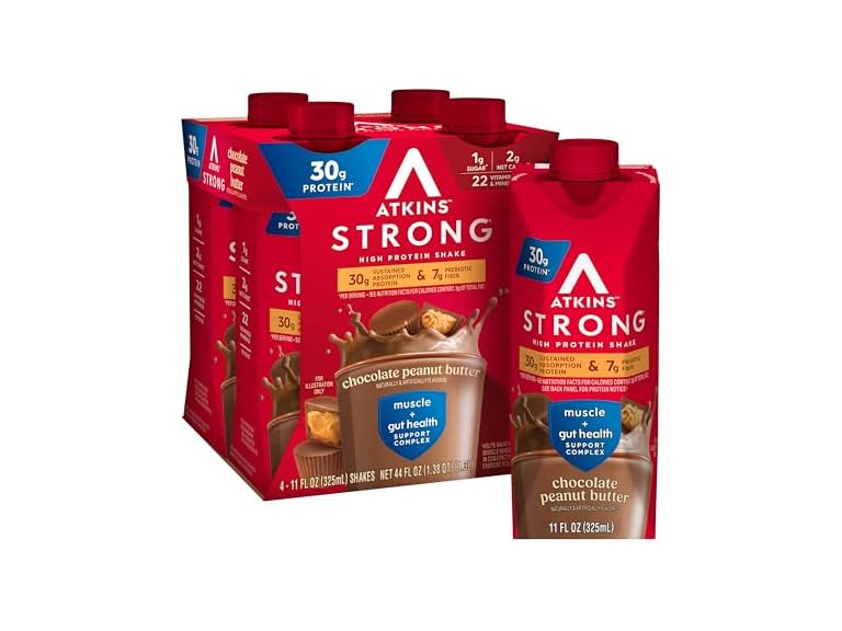 - PROTEIN-PACKED DECADENCE. Enjoy a deliciously smooth, chocolatey peanut butter flavored Atkins Strong High Protein Shake packed with 30g of protein to help satisfy your hunger and your sweet tooth. The flavor you love, without a ton of sugar or carbs.