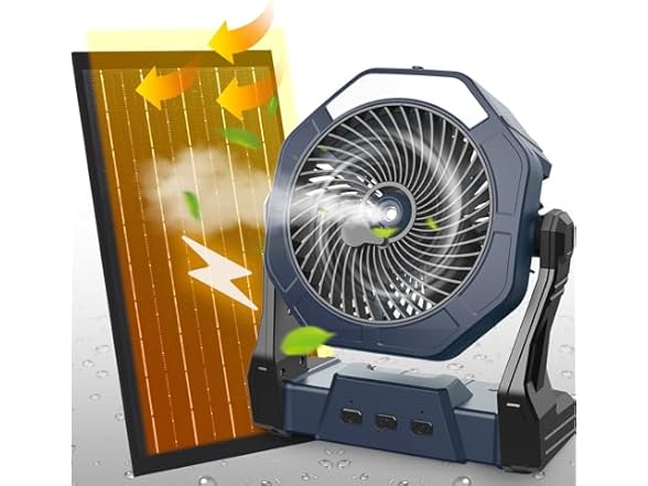 - ☀【10W High Efficiency Solar Panel】Our solar panels' charging efficiency and light sensitivity are higher than those of 4w/7w, made of monocrystalline silicon. Using the photovoltaic effect continuously provide power for camping fan, also be used as outdoor emergency power source for mobile phones, flashlights, etc.(Compared with the integrated solar fan, our fan can be placed in the shade while charging by solar panel. Avoid fan sun exposure and accidents)