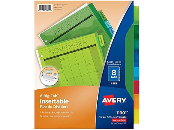 - (1) Avery Dividers for 3 Ring Binders, 8-Tab Plastic Binder Dividers Insertable Big Tabs, Multicolor, 1 Set (11901)