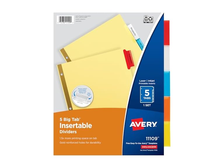 - (1) Avery Binder Dividers - 5-Tab Insertable Multicolor Big Tabs for Binders, 1 Set of Dividers (11109)