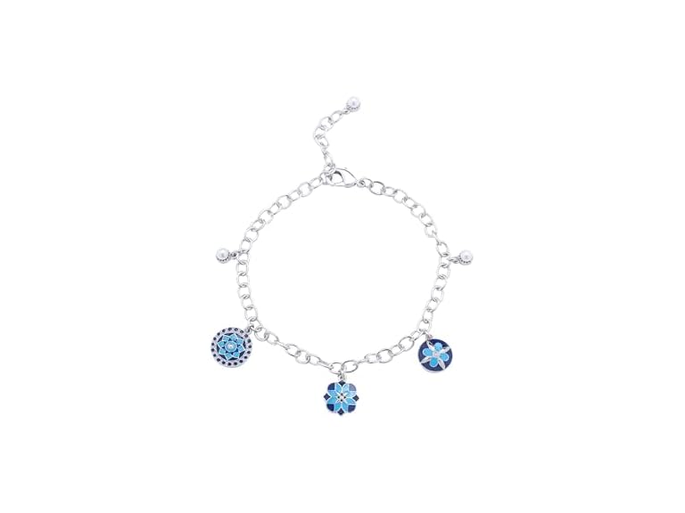 Cultural Connection This charm bracelet evokes the lush gardens surrounding Mehrangarh Fort, with a floret bunch encased within a sculpted metal frame resembling blooming petals. Its regal allure and vibrant color palette pay homage to Jodhpur's rich heritage and botanical splendor. Materials That Matter Crafted from high-quality brass with tarnish-resistant white rhodium plating and hand-enameled in rich blue tones, this piece is both durable and hypoallergenic. Details in the Design -Adjustable Chain Length: 8.5" + 2.5" -Weight: 6.8 g Slight variations in size and weight highlight the handmade nature of each piece, making it truly unique. Handcrafted Happiness Each piece is brought to life by skilled artisans using traditional techniques. The result is a one-of-a-kind treasure that celebrates craftsmanship and artistry. Effortless Elegance Perfect for any occasion, this piece transitions effortlessly from casual outings to formal celebrations. Wear it alone for subtle charm or pair it with matching accessories for a bold statement. Complete Your Collection Discover matching pieces in our Azure or Rosa collection to create a cohesive, personalized look that celebrates your style. Clean with Care To maintain its beauty, avoid contact with water, perfumes, and harsh chemicals. Store it in the included Navicia gift box or an airtight container, and clean gently with a soft cloth. Packaged to Perfection Arriving in a sturdy, signature blue Navicia box, this piece is ready for gifting and designed to protect your treasure. Moments of Magic From the joy of unboxing to the smiles it inspires every day, this piece brings magic to life's special moments. Whether gifting or wearing it, it creates memories to cherish.