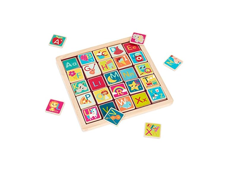 - (1) B. toys – Wooden Alphabet Puzzle – Double-Sided Puzzle & Chalkboard – 26 Magnetic Letter Pieces – 3 Years + – Magnetic Alphabetic