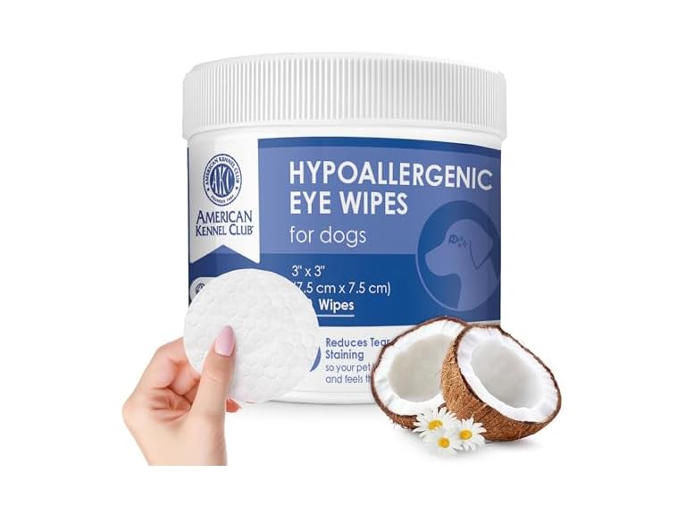 - (1) AKC Pet Eye Wipes for Dogs & Cats – Tear Stain Remover & Eye Discharge Cleaner – Hypoallergenic Grooming Wipes, 100 Count (Coconut Scent)