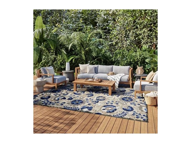 - (1) Nourison Home Aloha Indoor/Outdoor Natural/Blue 7'10'' x 10'6'' Area-Rug, Easy-Cleaning, Non Shedding, Bed Room, Living Room, Dining Room, Backyard, Deck, Patio (8x11)